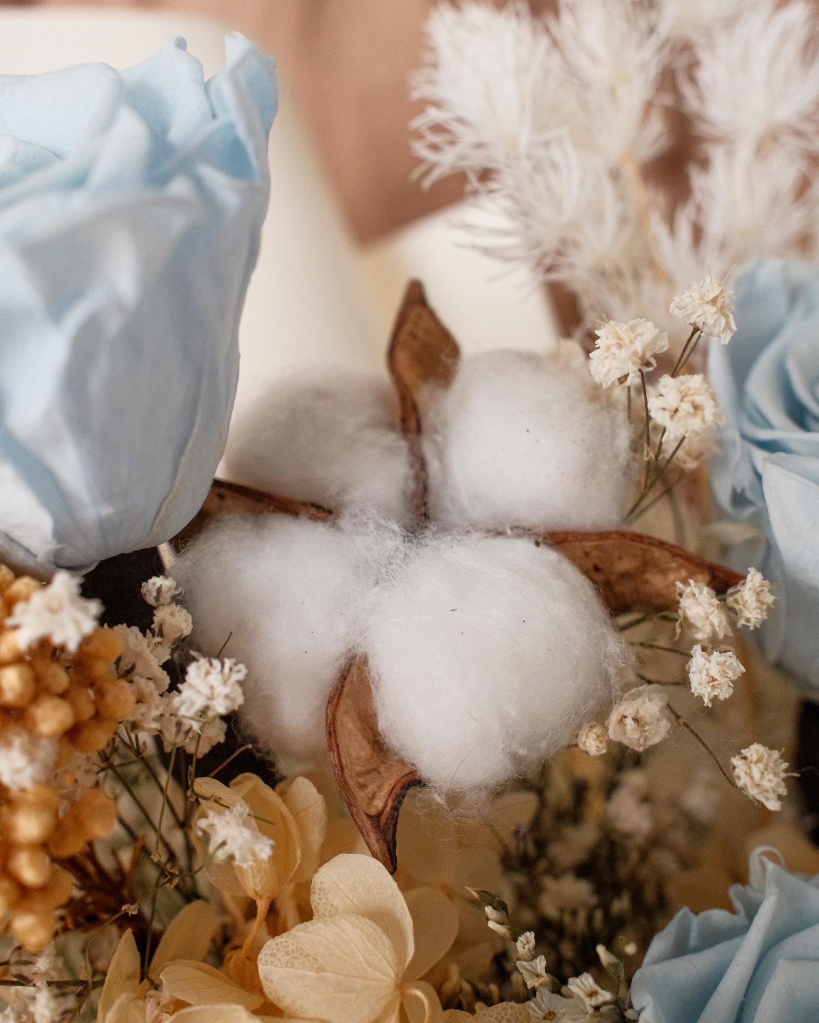 5 Stalks of Blue Preserved Roses, Peach Hydrangeas, Cotton Flowers, Other Dried Flower Foliage.
