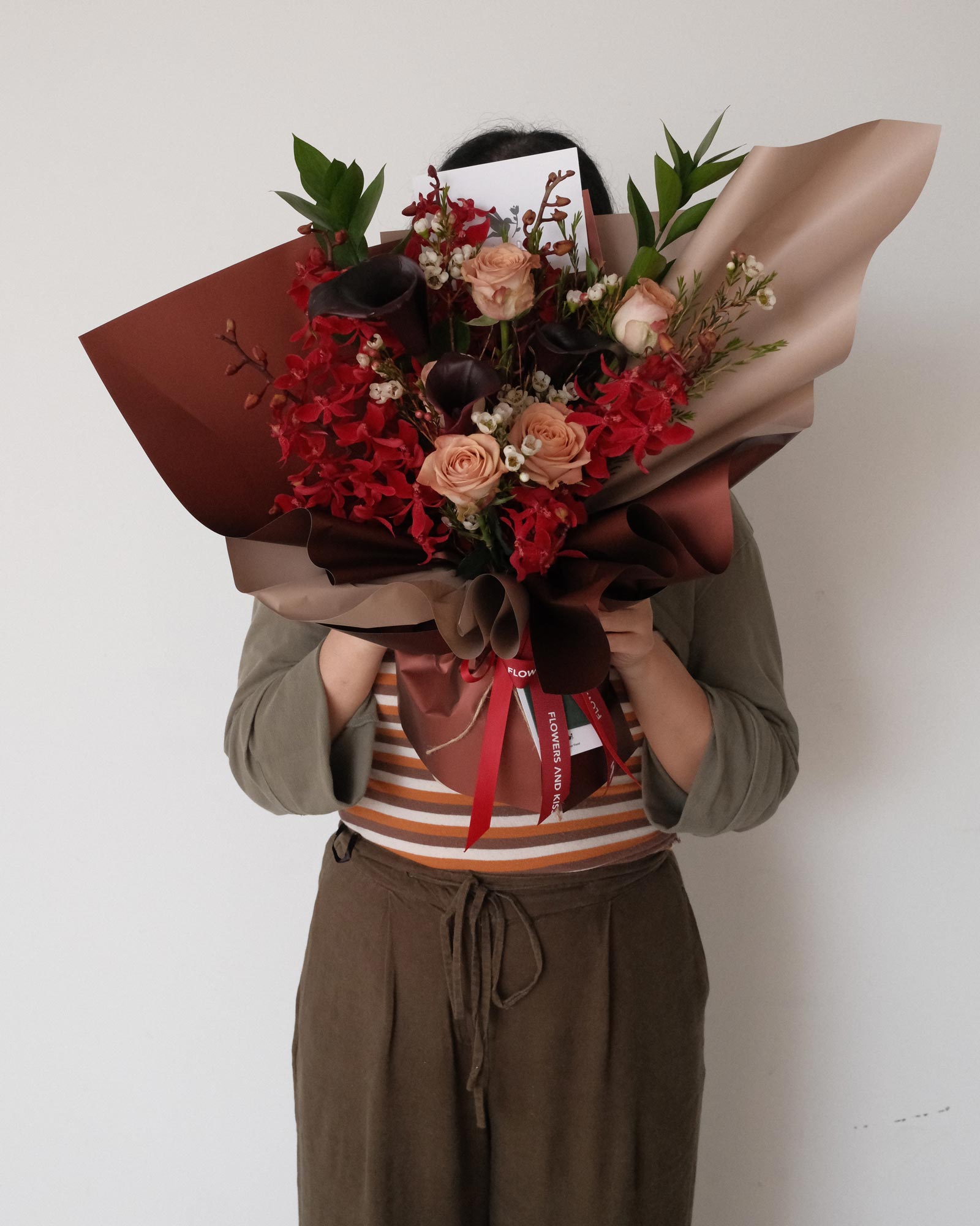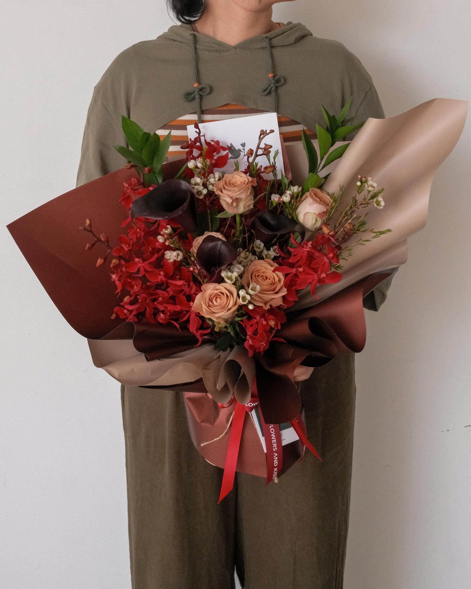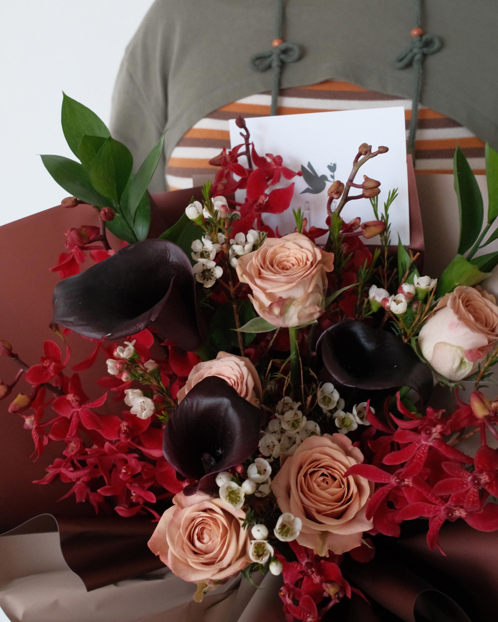 The mysterious elegance of the dark hue Calla Lilies is complimented by the blooms of the cappuccino roses, which charms the feminine heart.