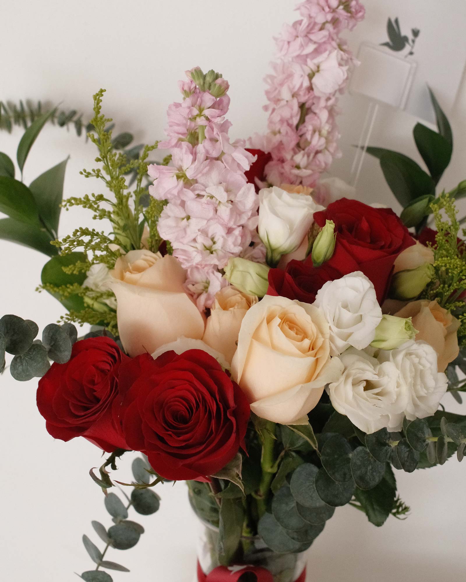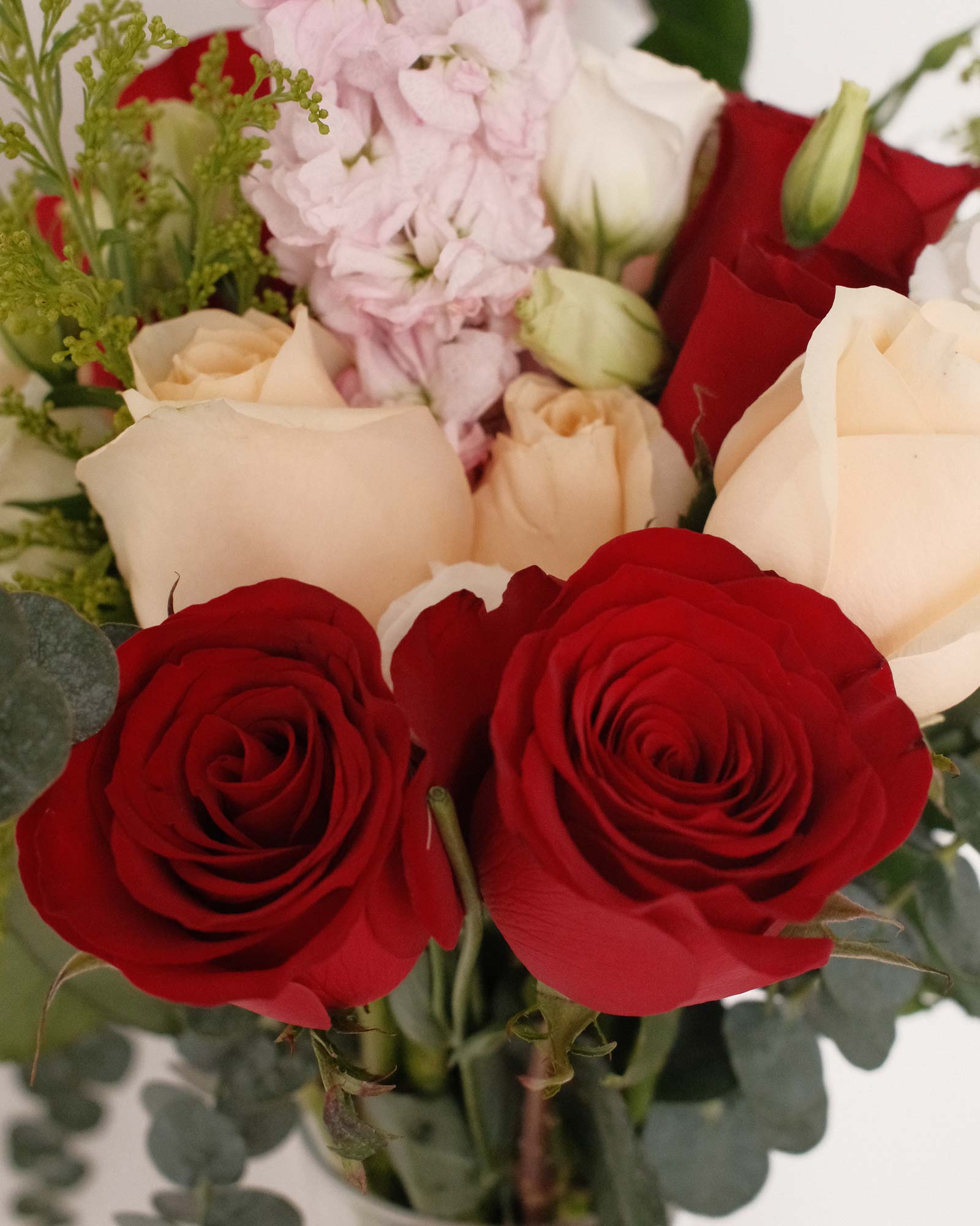 Contains: Description: 8 Champagne Rose, 8 Red Rose, White lisianthus, Foliage
