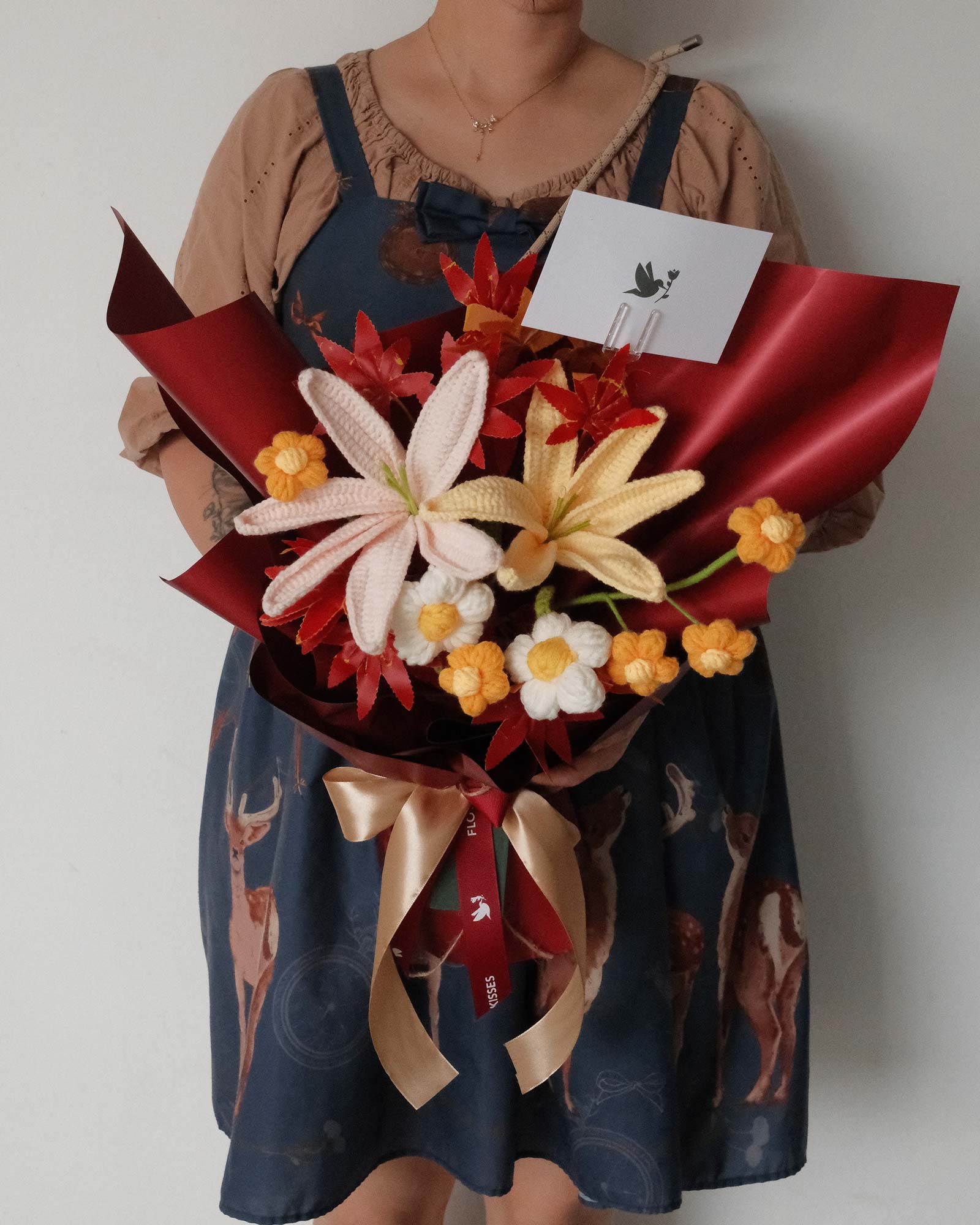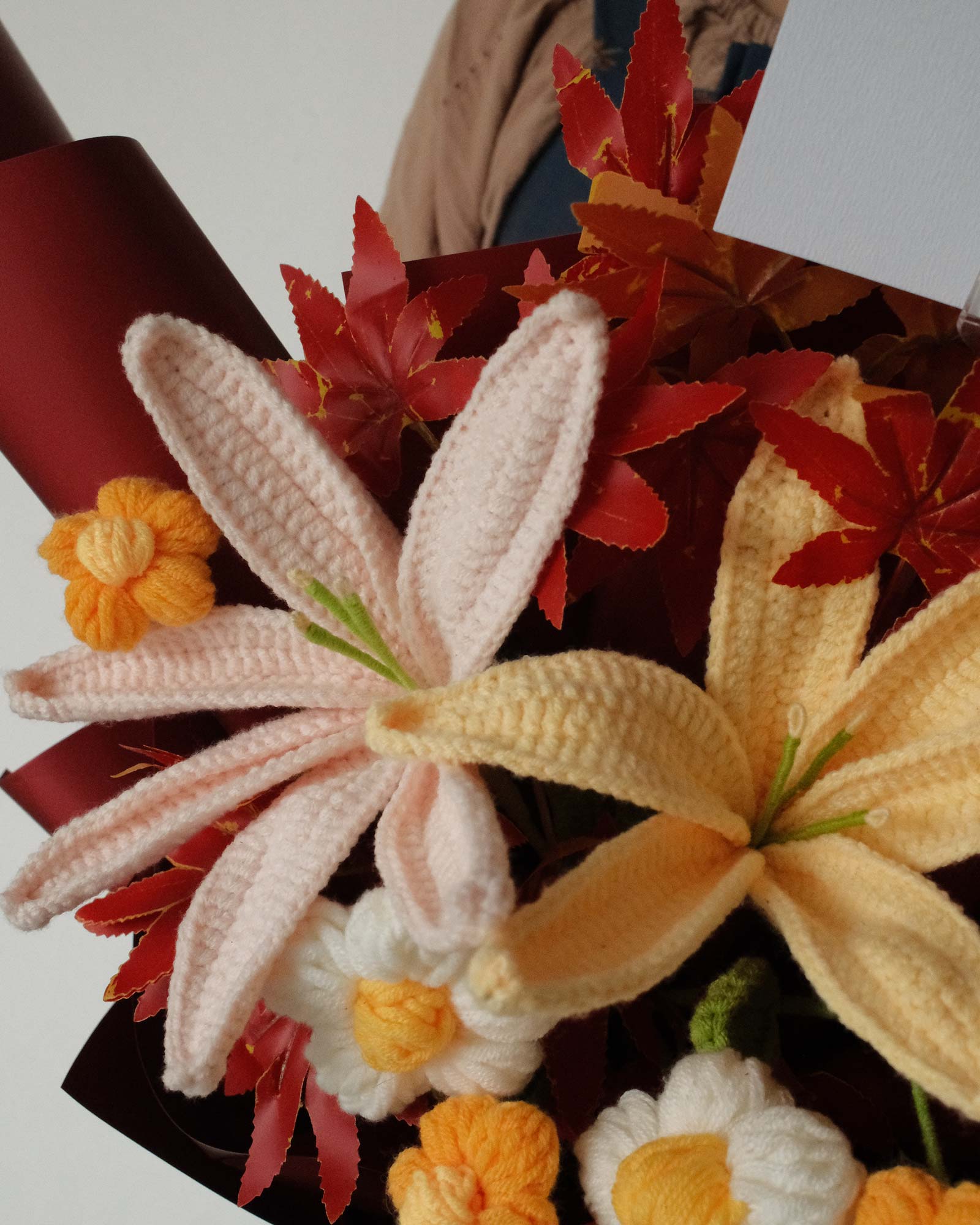 Contains: 2 Crochet Lilies,1 Crochet Daisies,1 Crochet Daisy,1 Crochet Clover & Faux Maple Leaves