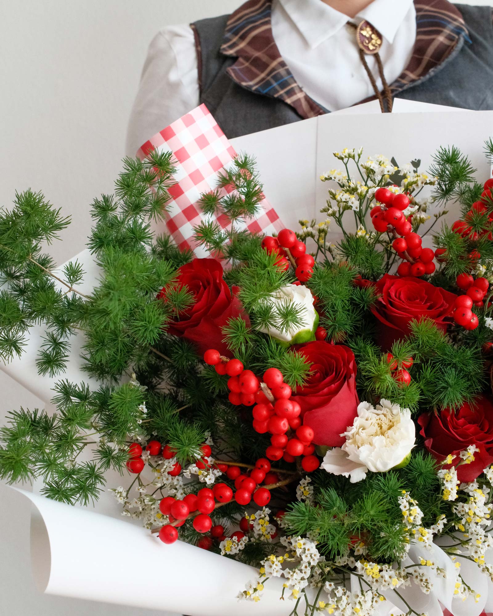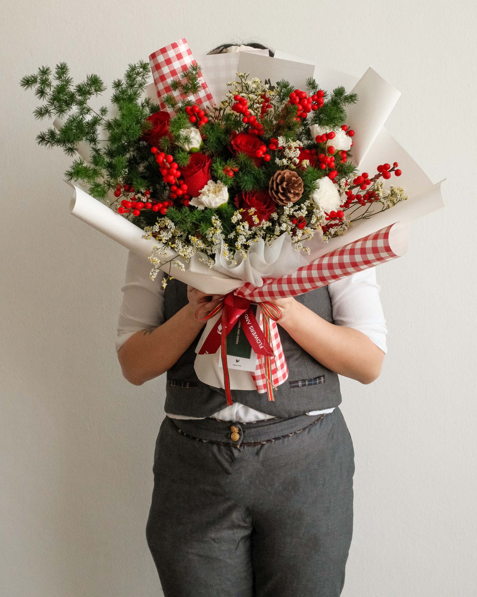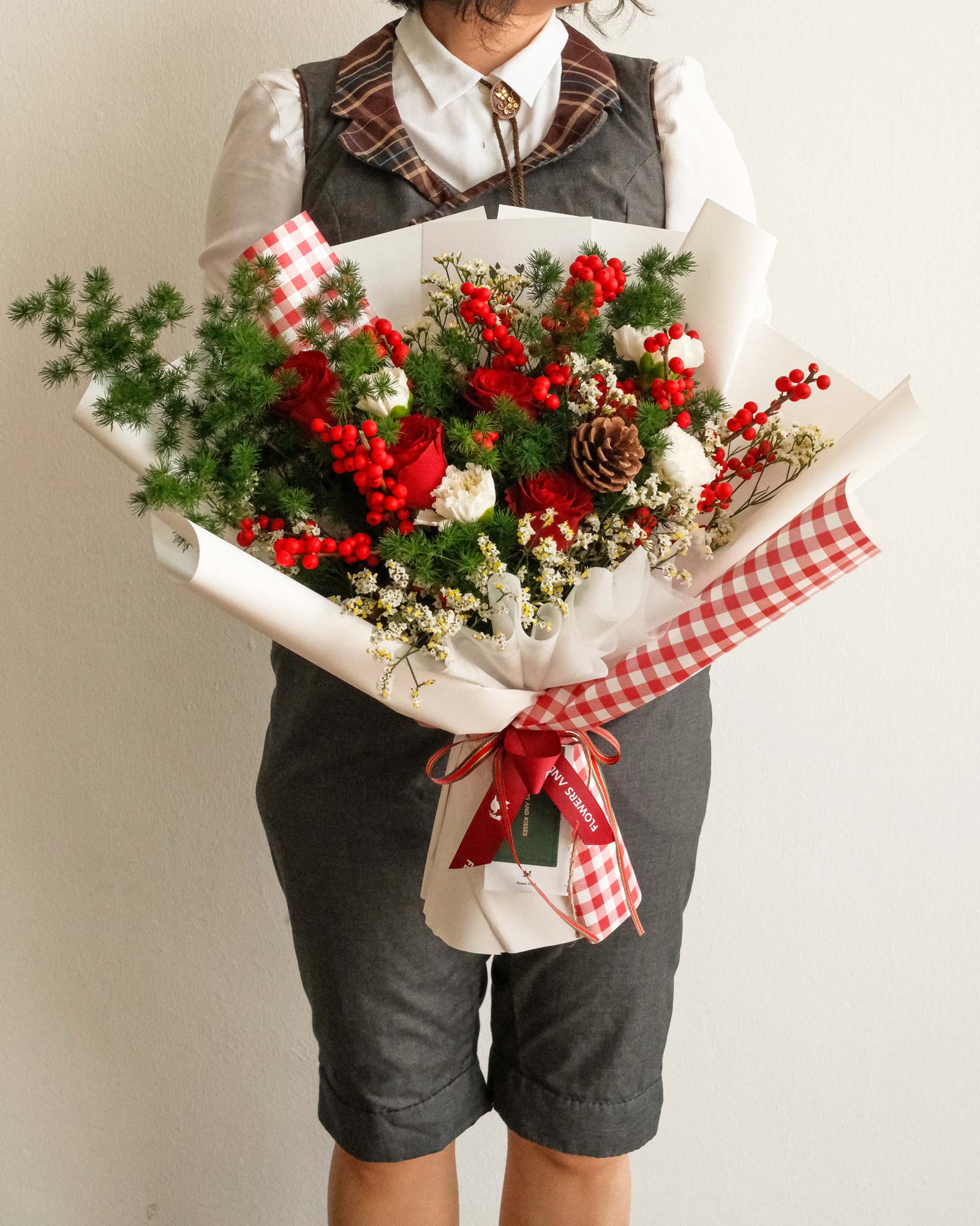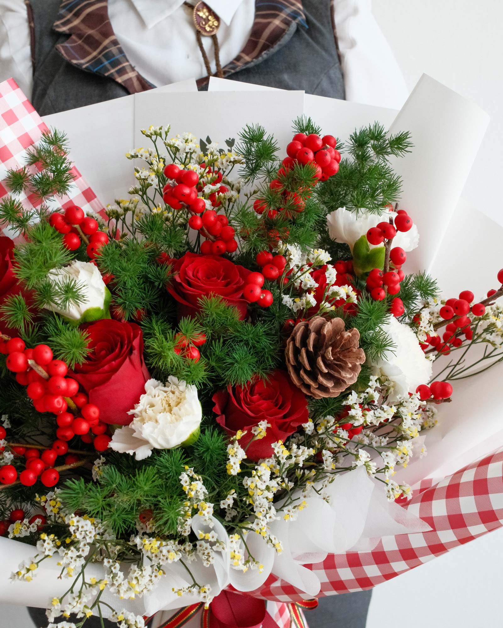 Red Roses, Winterberries, White Carnations, Pine Cone, Foliage