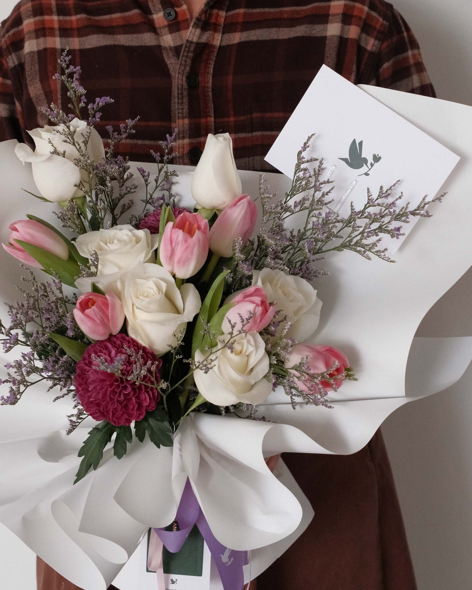 6 Pink Tulips, 6 White Roses, 2 Chrysanthemum Poms, Caspia.