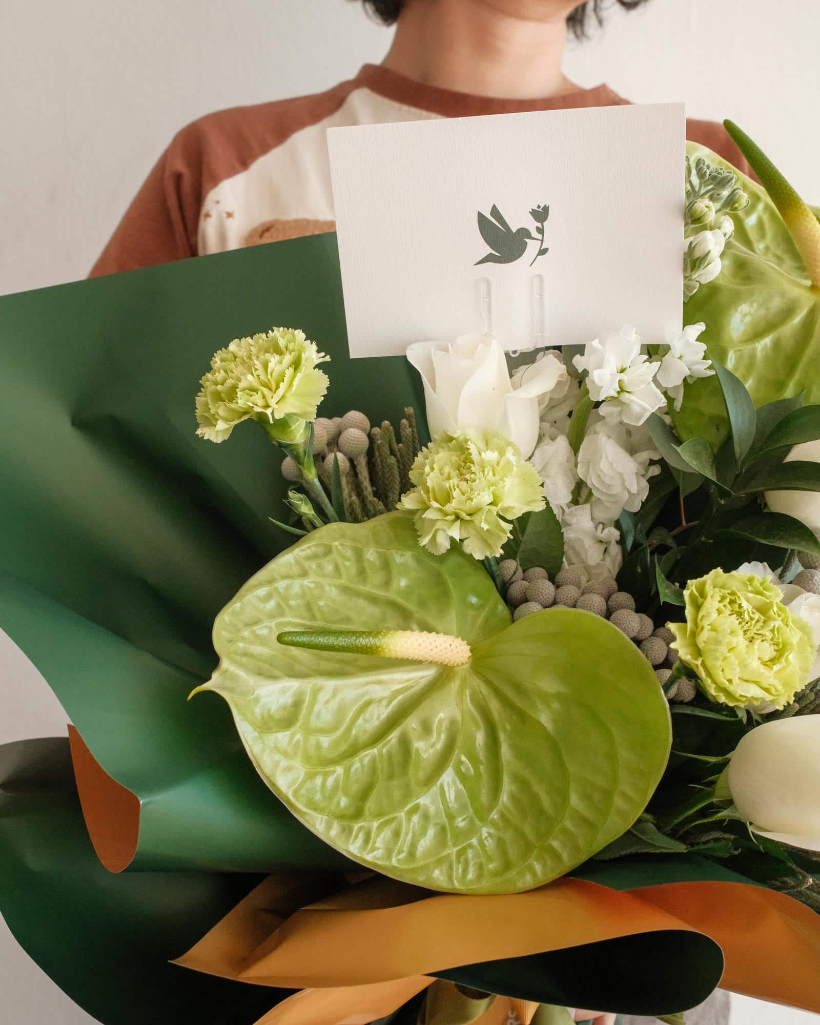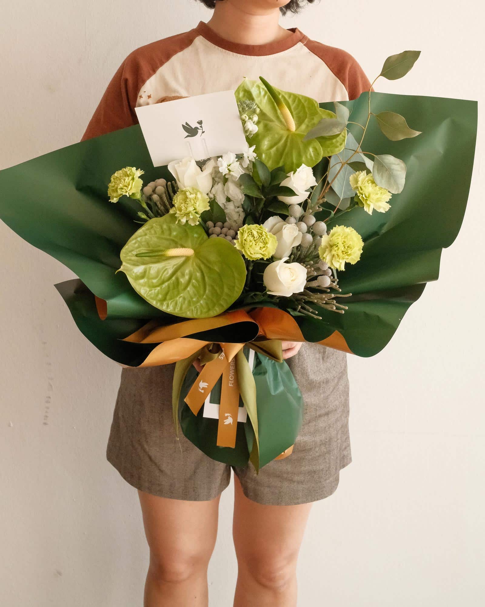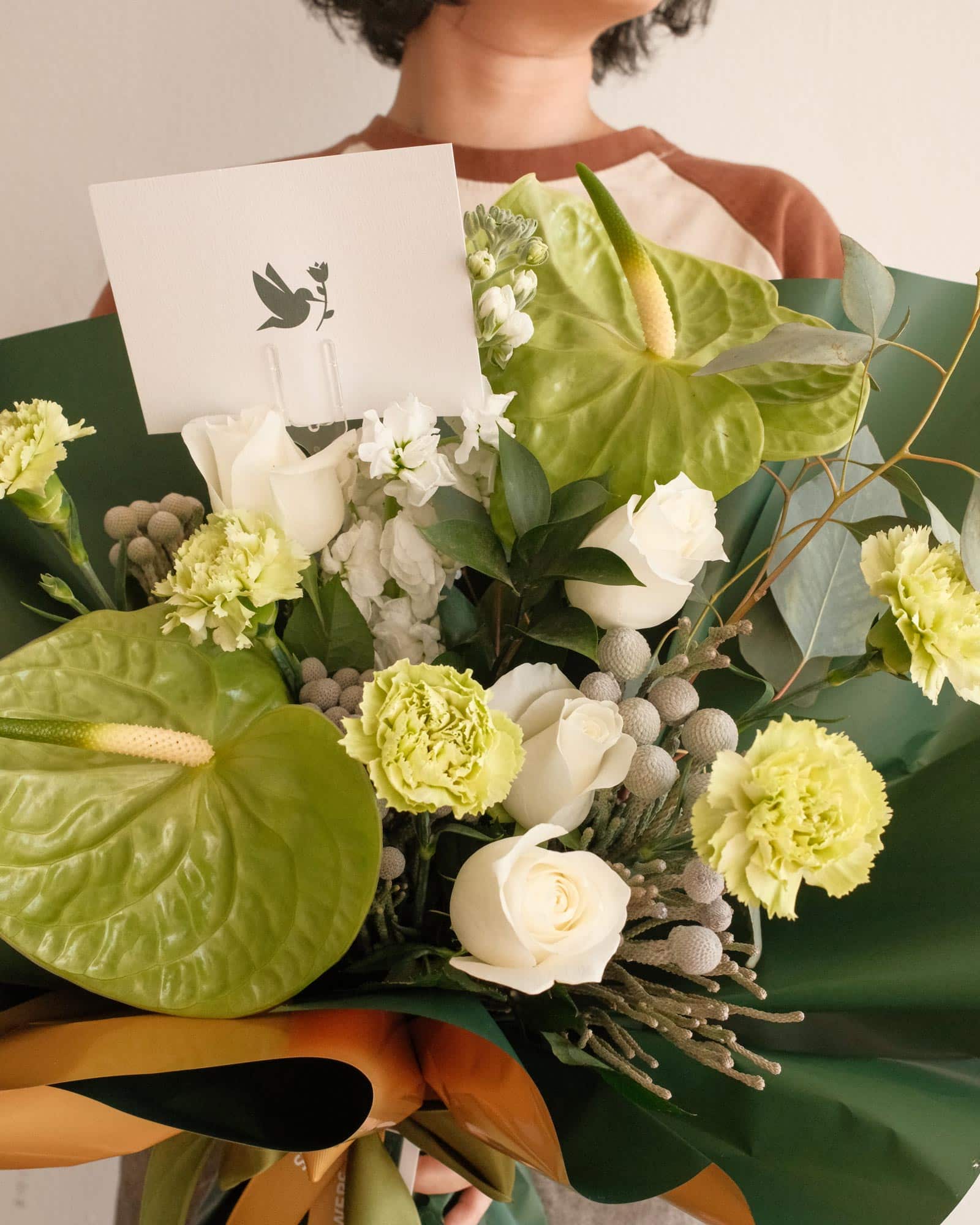 5 Green Carnations, 4 White Roses, 2 Green Anthuriums, Mathiola, and Foliage.