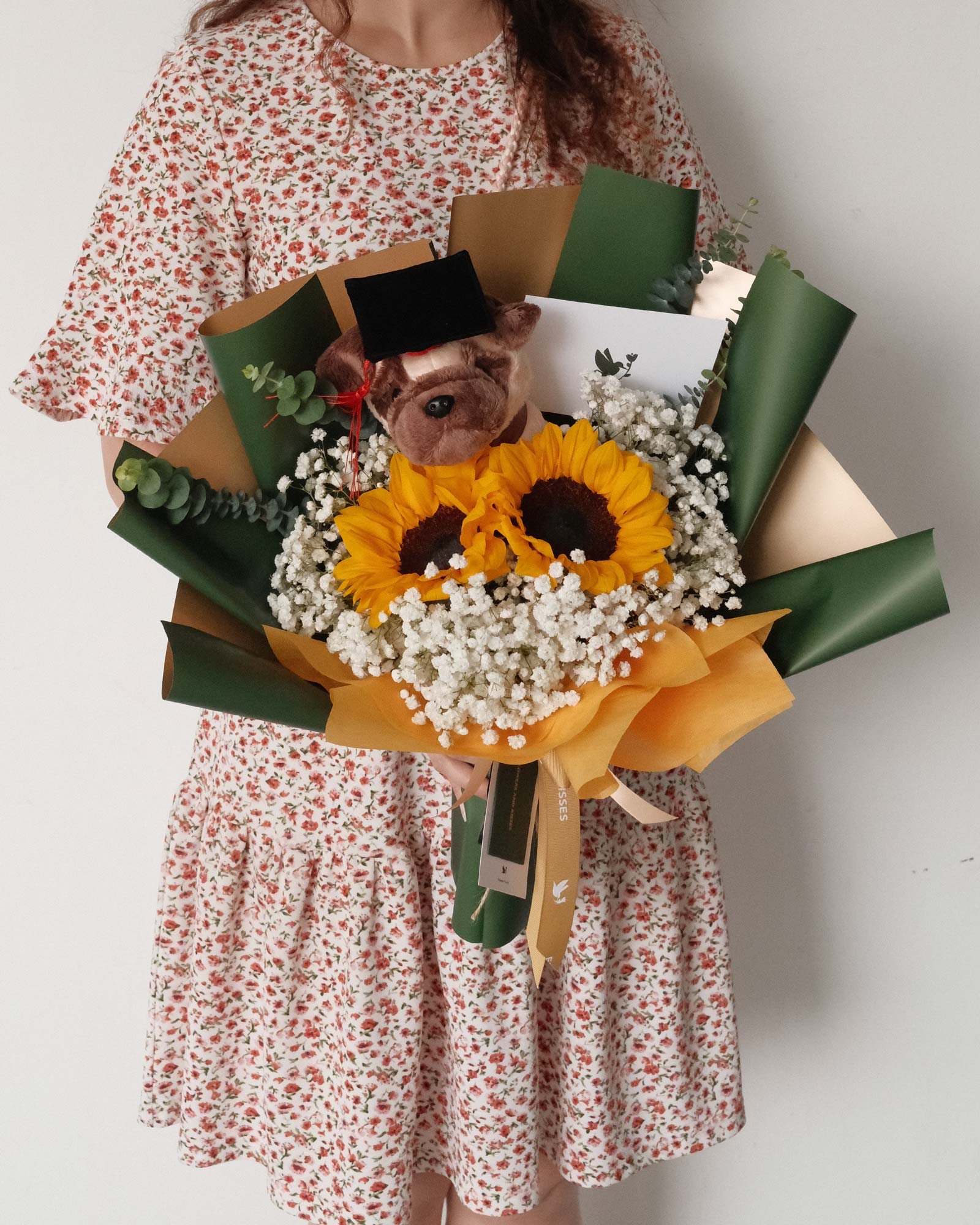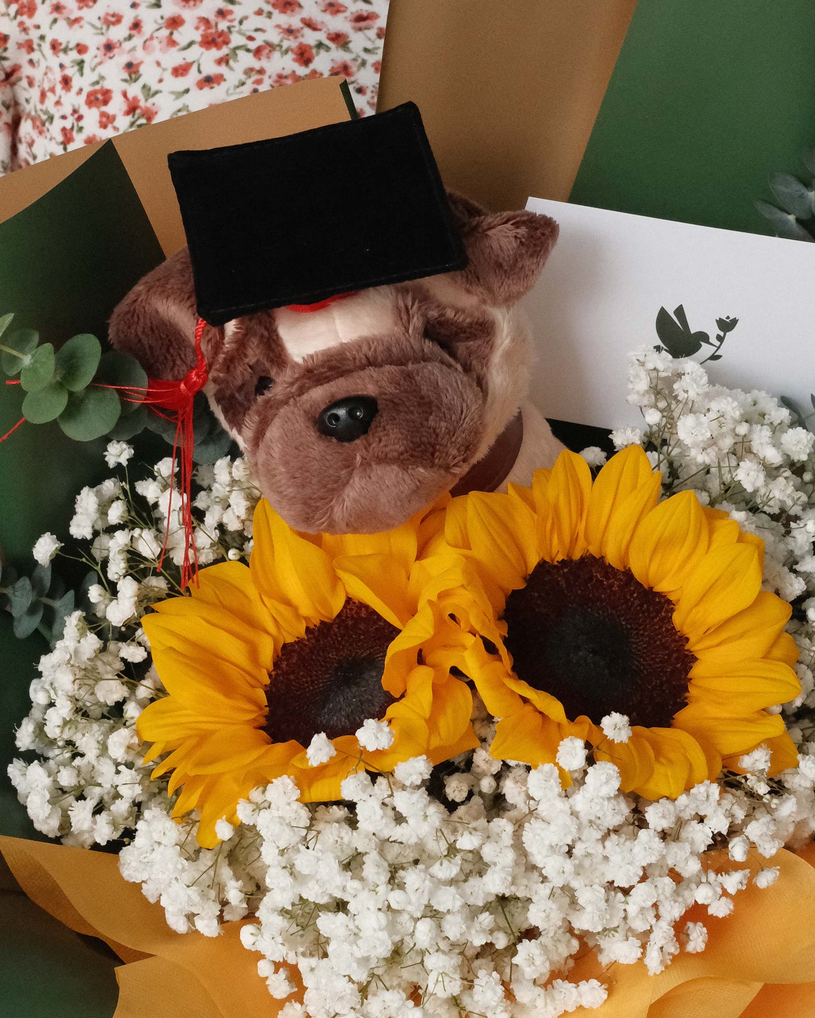 Featuring a lovable plush dog and a charming bouquet of fresh flowers, this gift will have them wagging their tail in excitement.