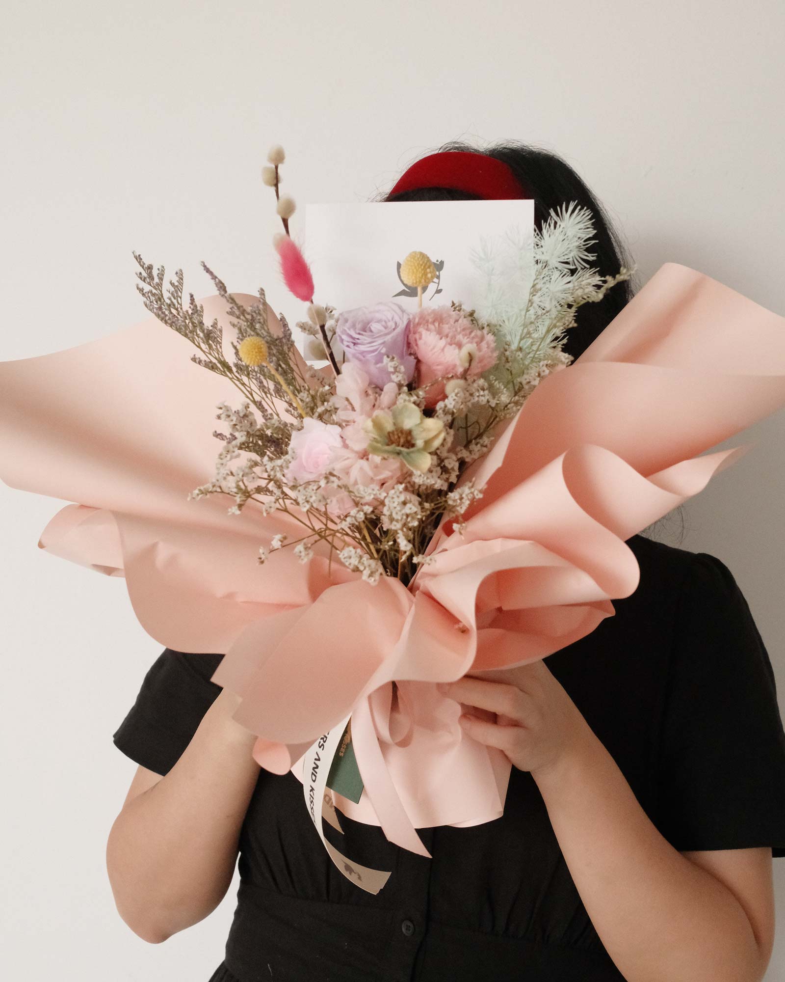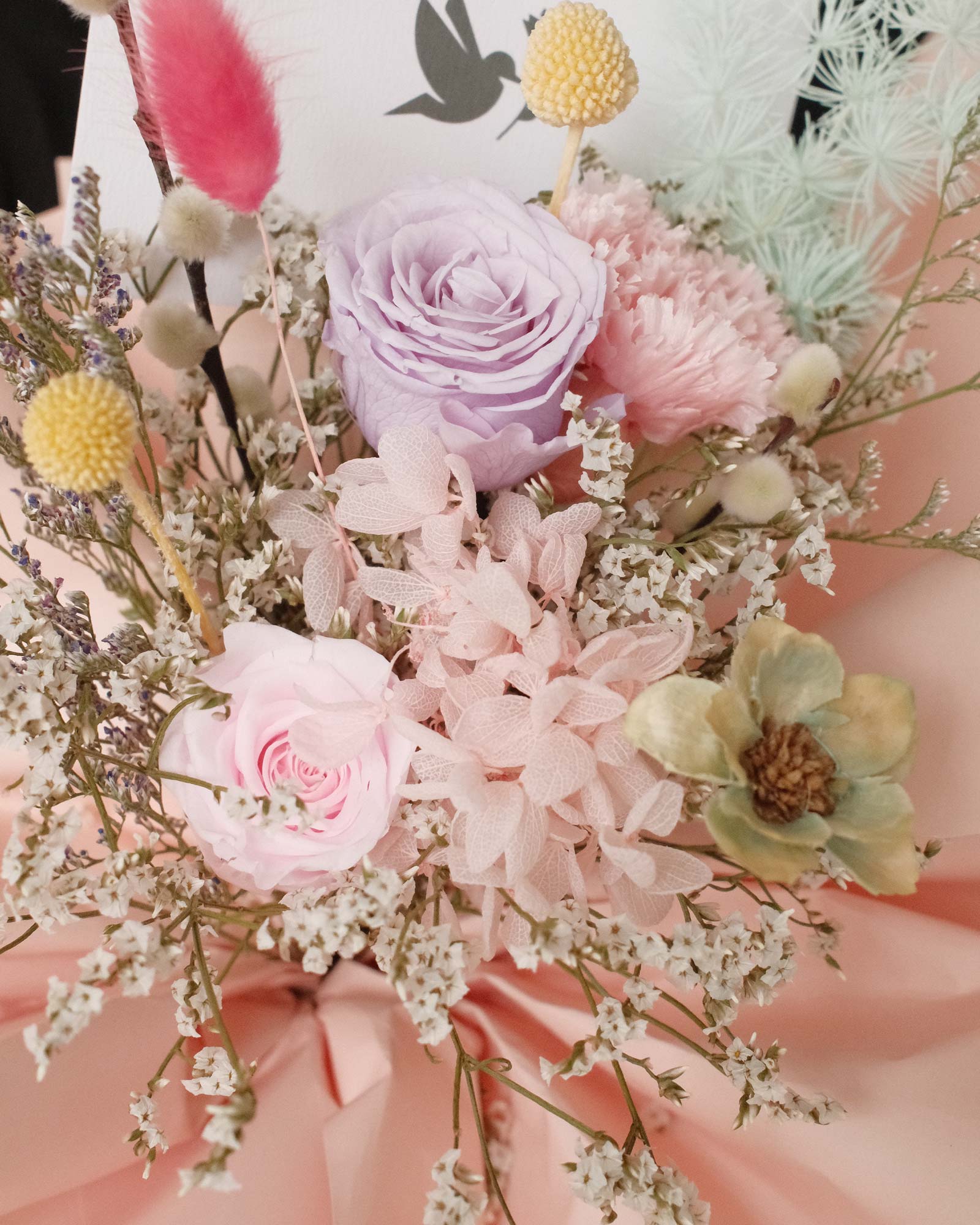 Flowers Preserved Roses · Preserved Pink Carnations · Dried Foliage