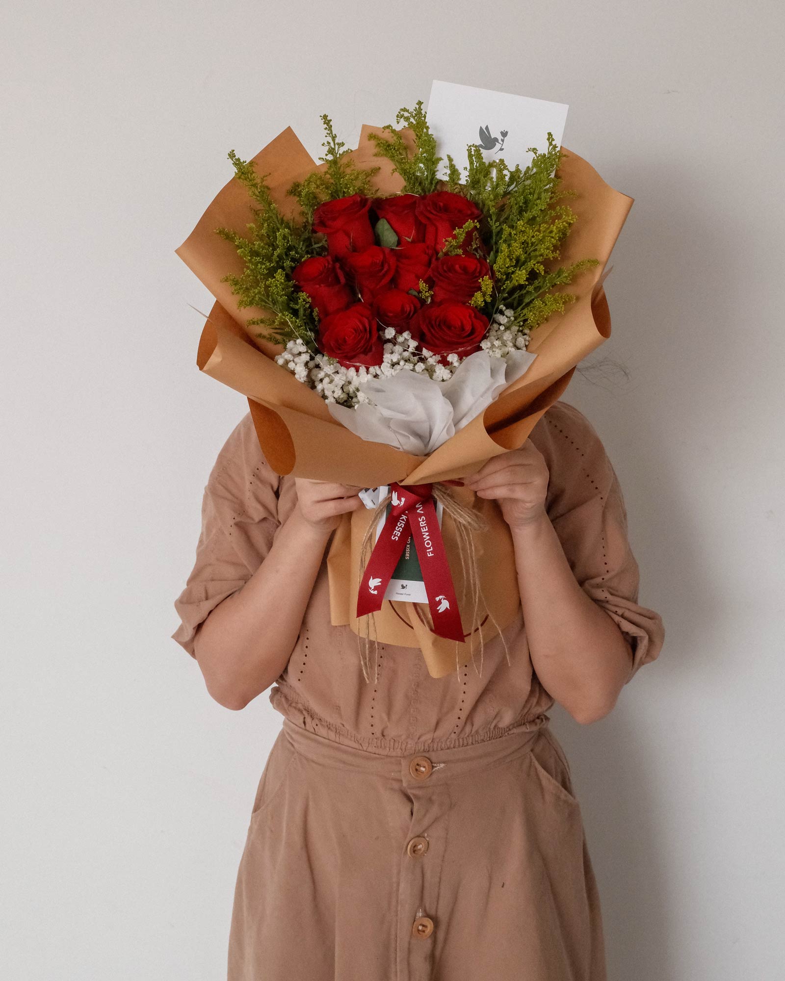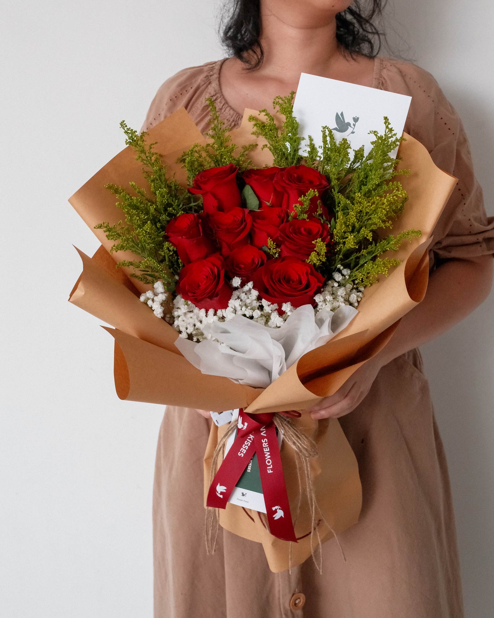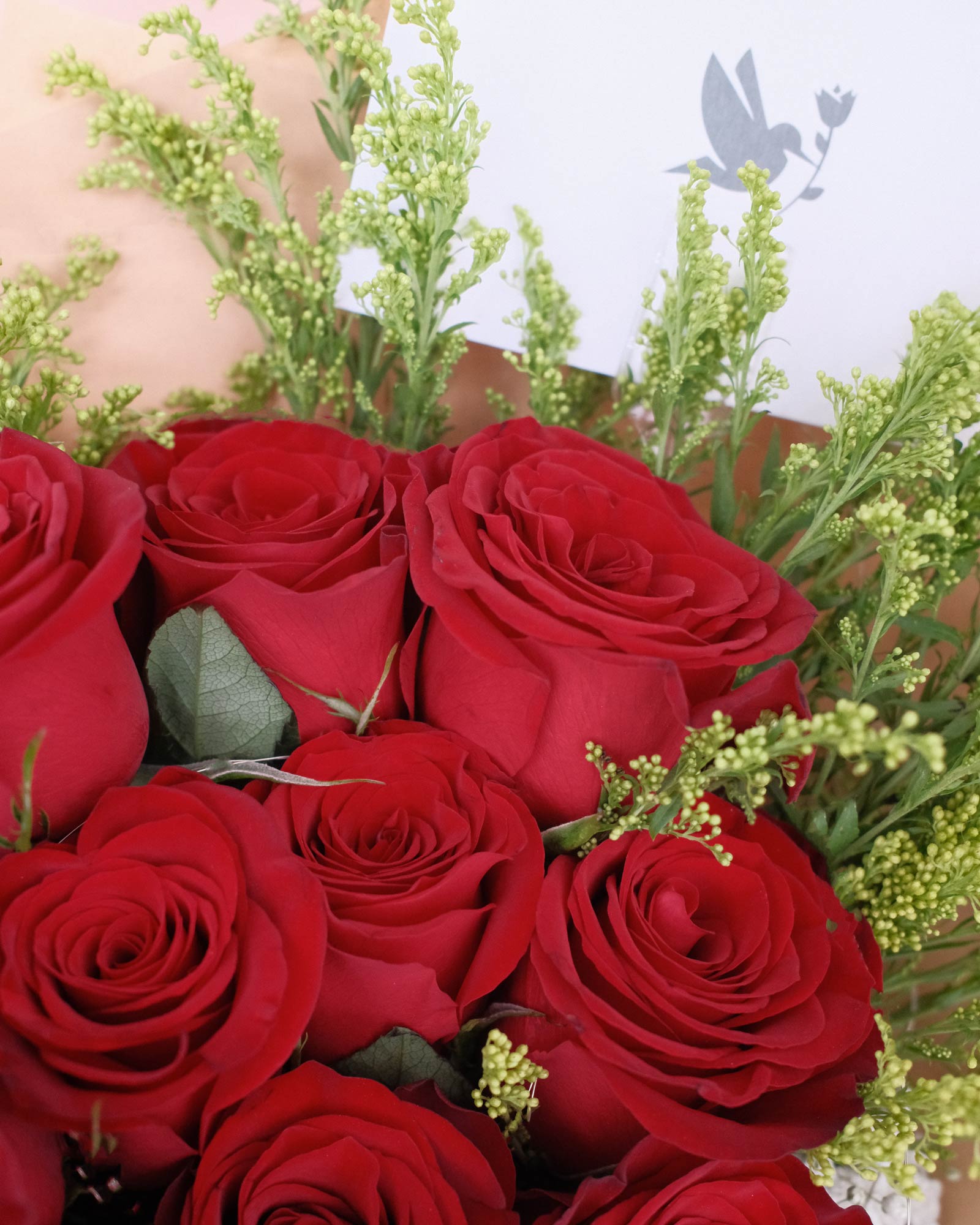 Contains: 10 Red Roses, Golden Phoenix, Baby’s Breath, Foliage