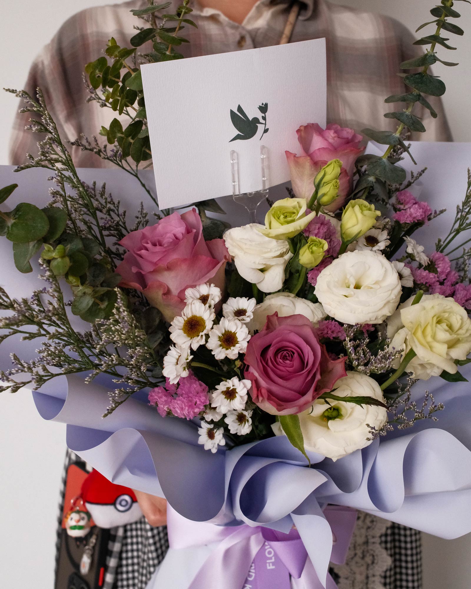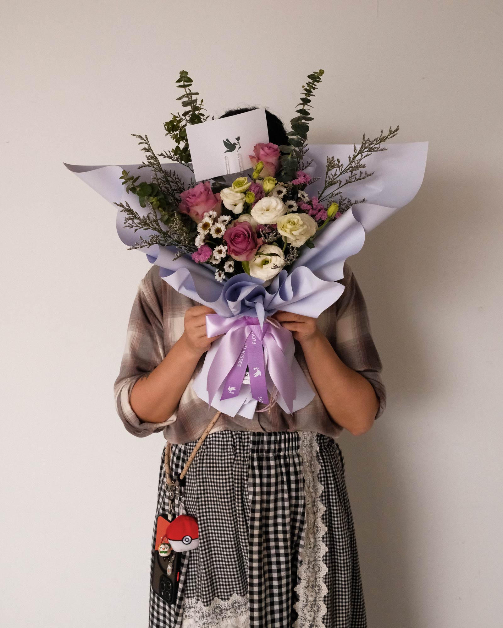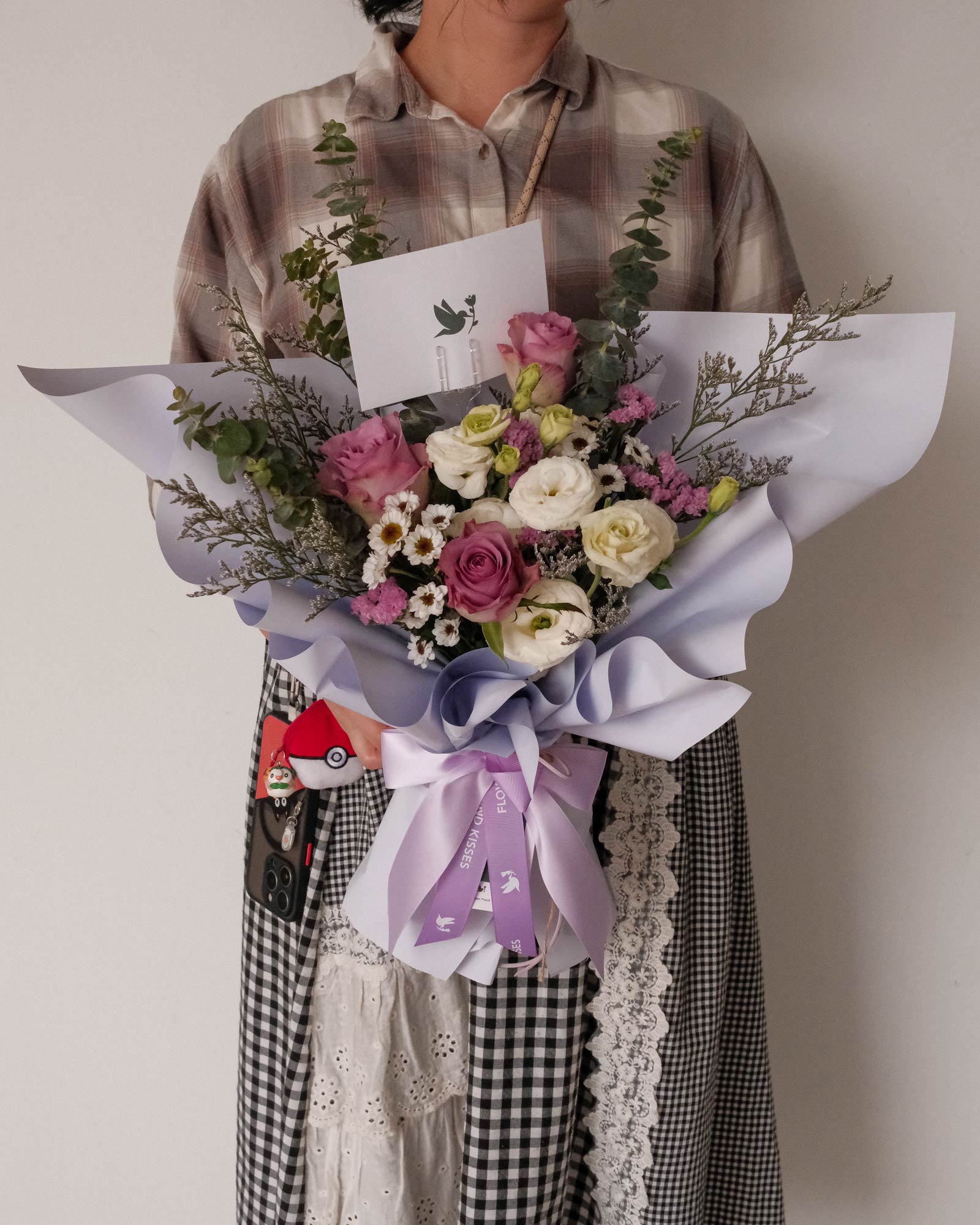 Plum is a thoughtfully curated bouquet, where the rich tones of purple roses are balanced by the soft glow of white lisianthus and the natural touch of foliage