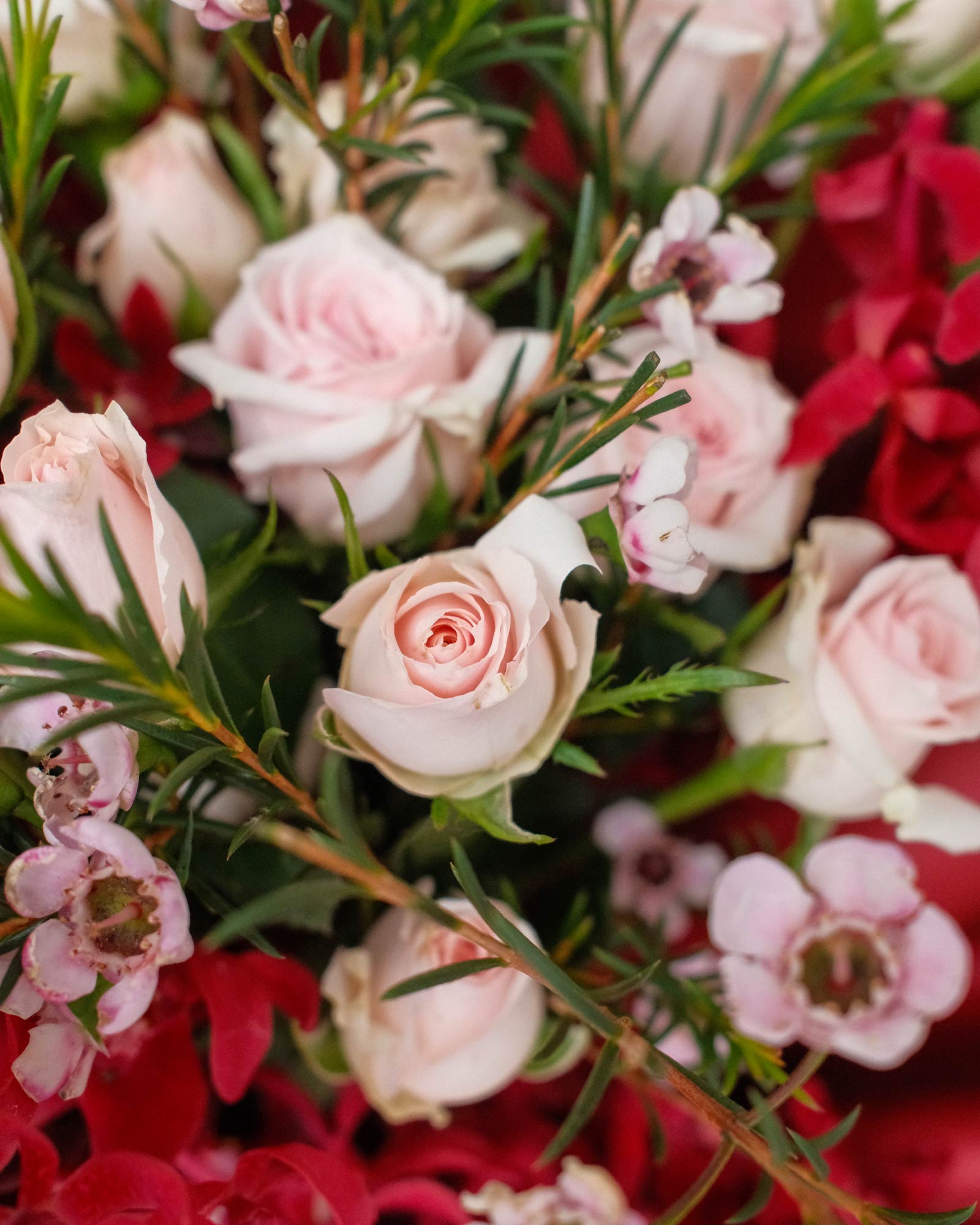 5 Stalks Rose Spray (Miniature Roses), 6 Stalks Orchid, Wax Flower, Foliage.