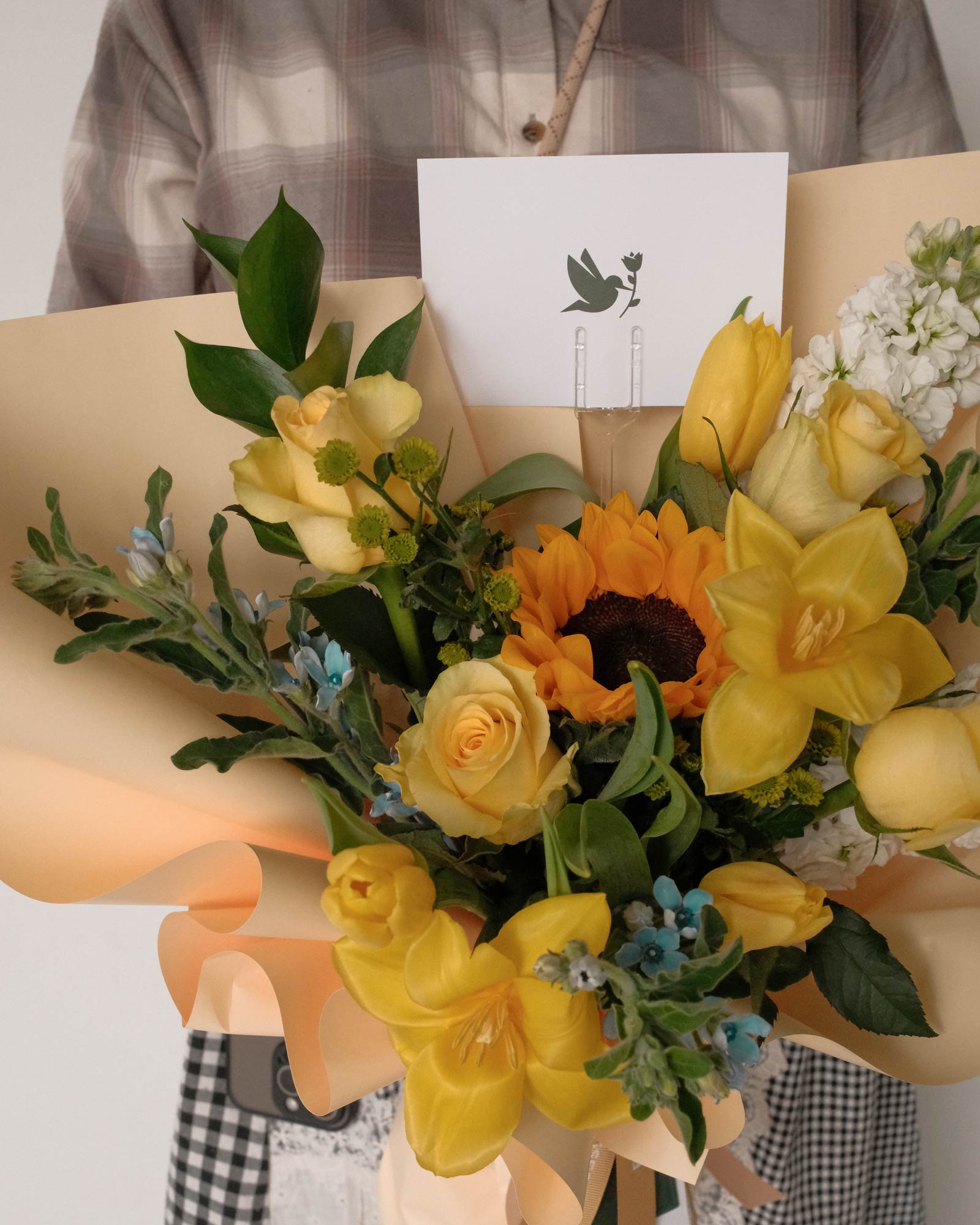 1 sunflower, 4 yellow roses, 5 yellow tulips, mini pom, mathiola, Oxypetalum Blue, foliage