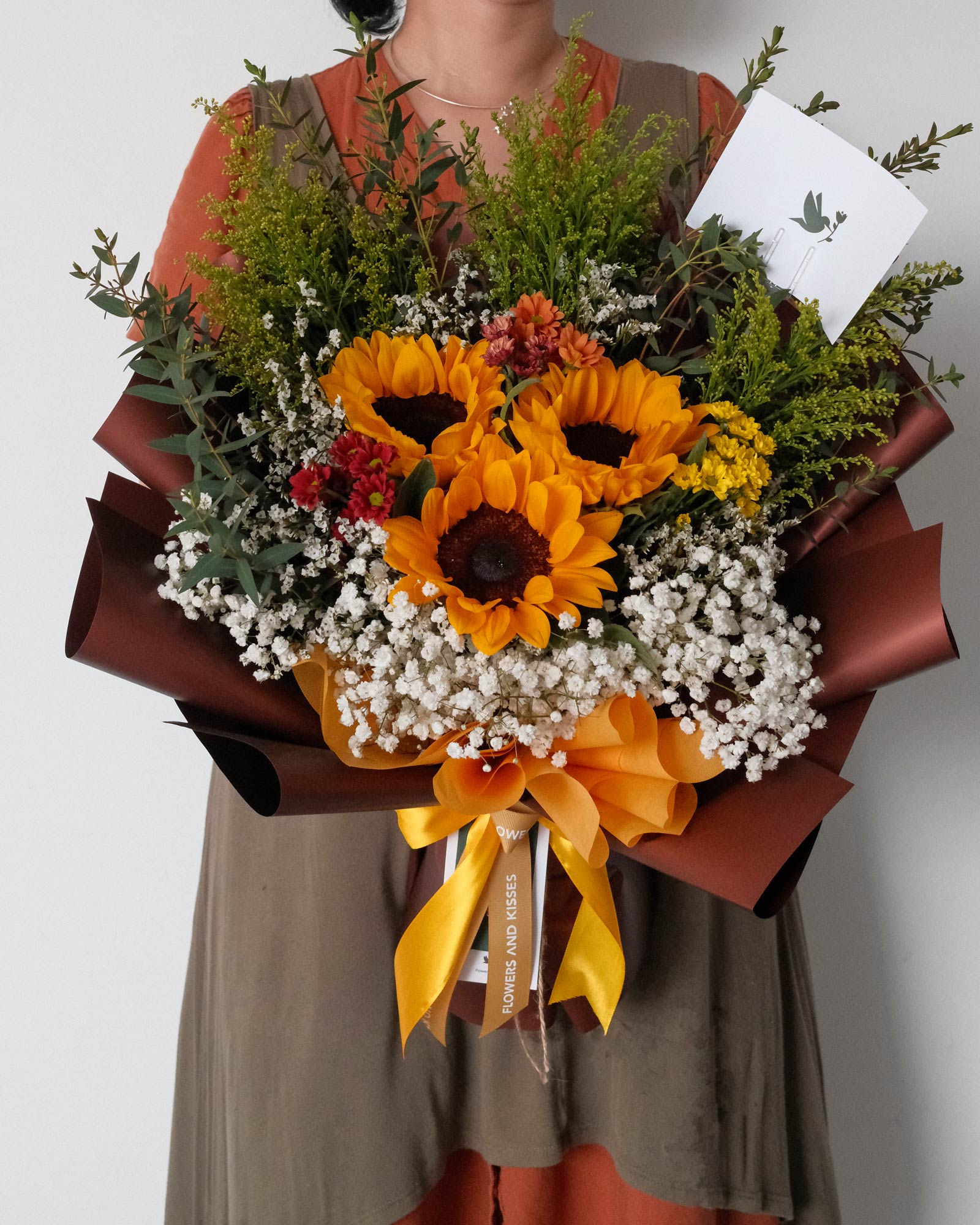 *Do note that the size of sunflower blooms may vary. Our florist will handpick the largest sunflower bloom of the day and arrange in the bouquet. That is the beauty of nature! Rest assured that colour themes and style will be in accordance with your choice.