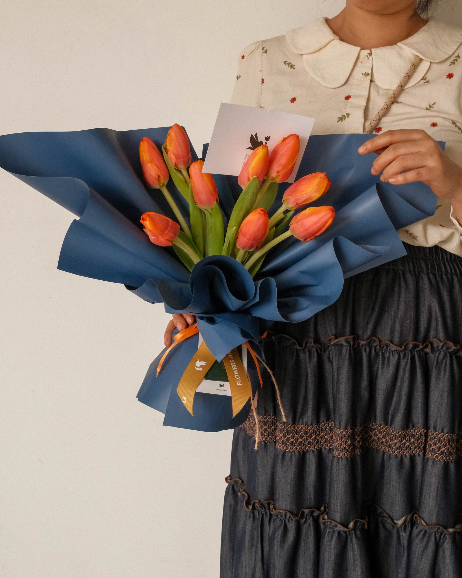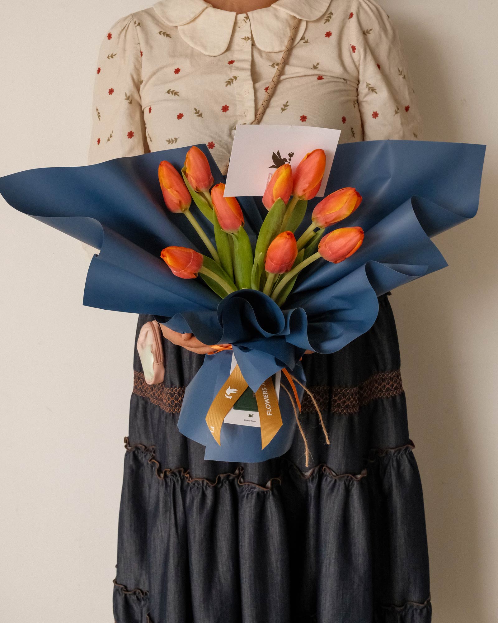 Just like the mystical hour between day and night, the Twilight bouquet is a blend of bold and serene, with its brilliant orange tulips nestled in a soft blue wrapping.
