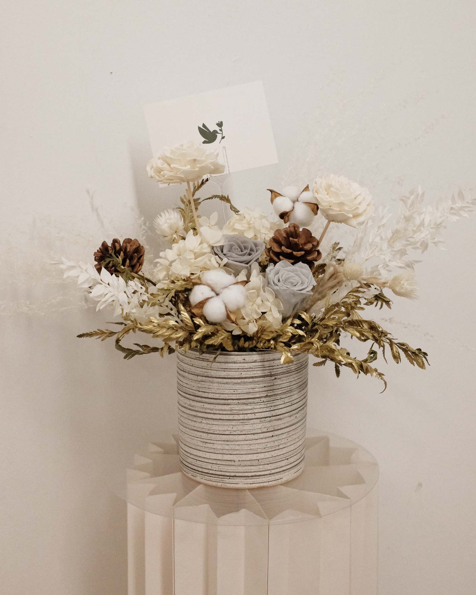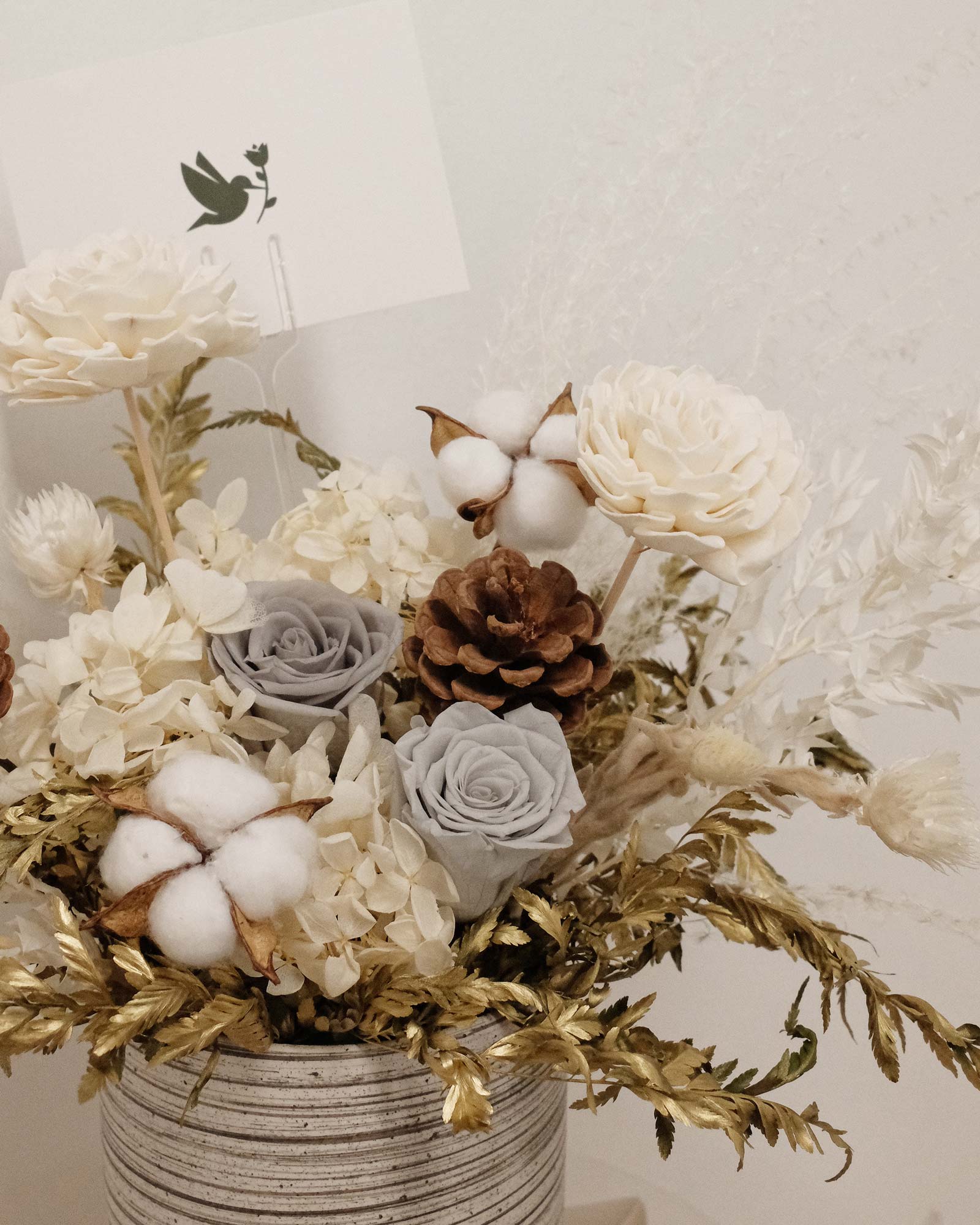 Contains : 2 Grey Preserved Roses, 2 Cotton Flowers , 2 Pinecones , 2 White Sola Wood Flowers , White preserved hydrangeas & Other Mix Dried Flower Folliages