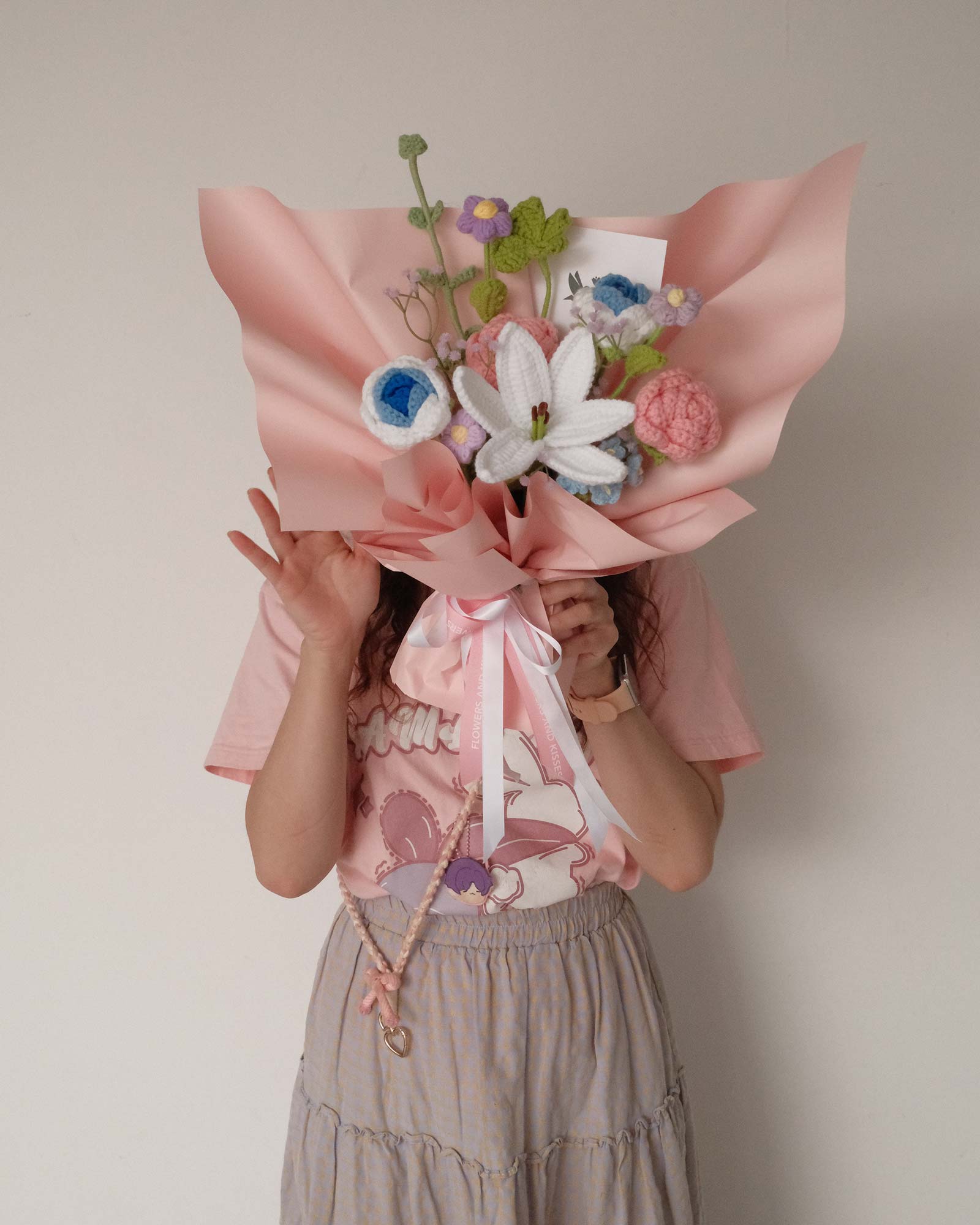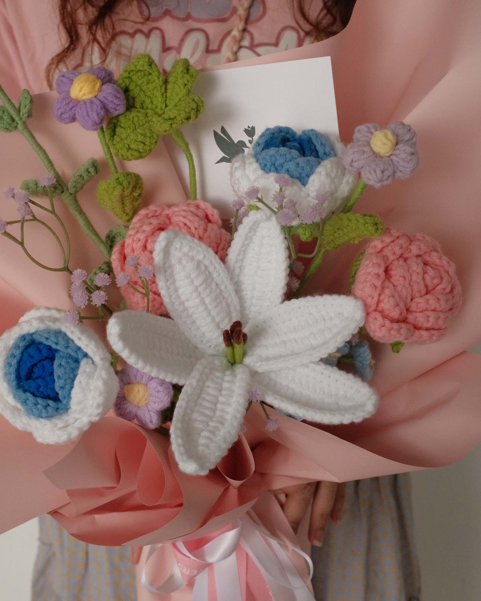 Contains: 1 Crochet Lily, 2 Pink Crochet Roses, 2 Two Tone Blue Crochet Rose, Other Crochet Flowers & Faux Foliage